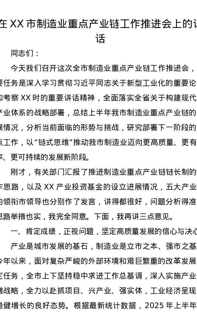 在XX市制造业重点产业链工作推进会上的讲话