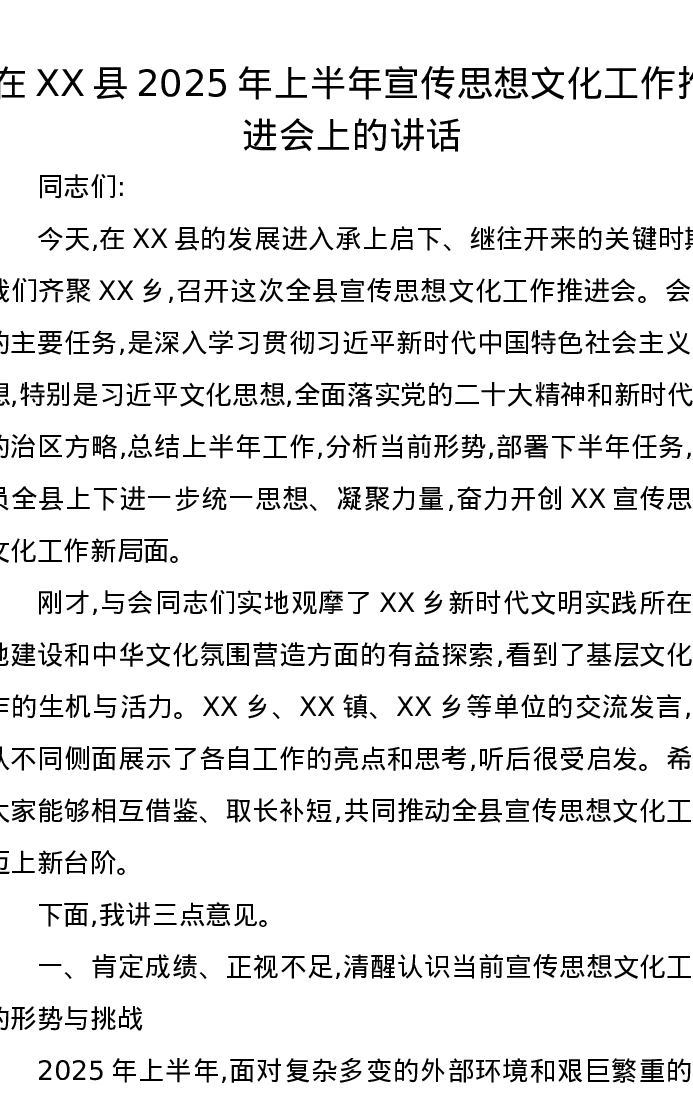 在XX县2025年上半年宣传思想文化工作推进会上的讲话