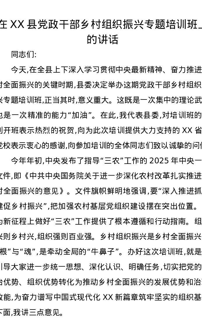 在XX县党政干部乡村组织振兴专题培训班上的讲话