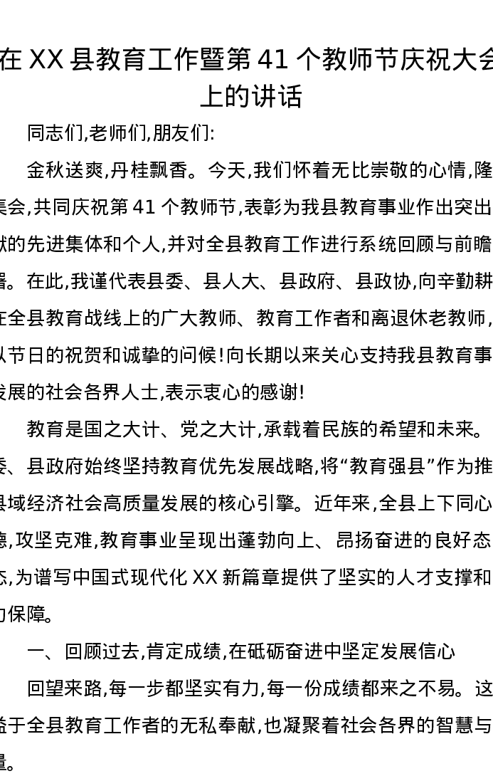 在XX县教育工作暨第41个教师节庆祝大会上的讲话