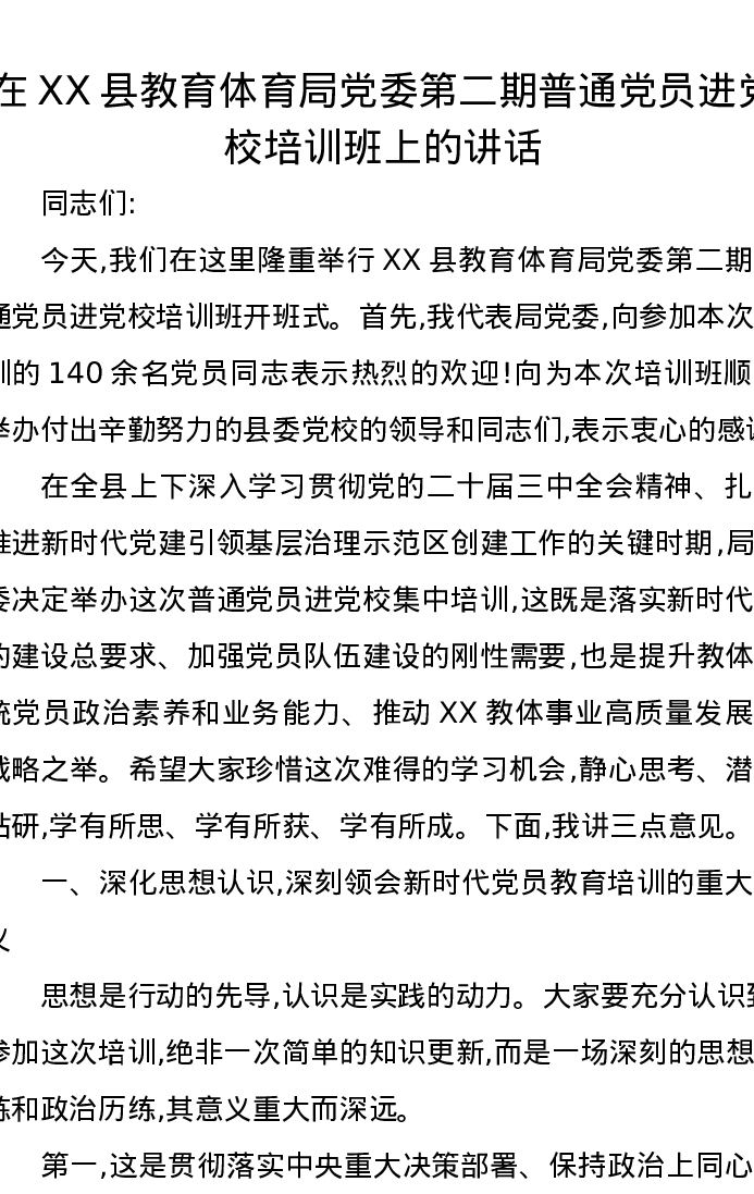 在XX县教育体育局党委第二期普通党员进党校培训班上的讲话