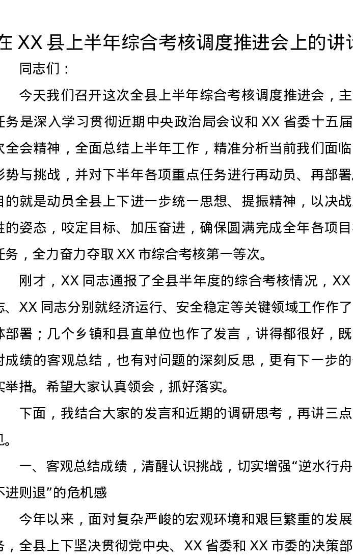 在XX县上半年综合考核调度推进会上的讲话