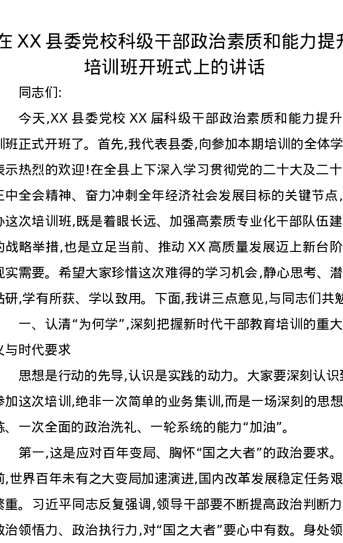 在XX县委党校科级干部政治素质和能力提升培训班开班式上的讲话