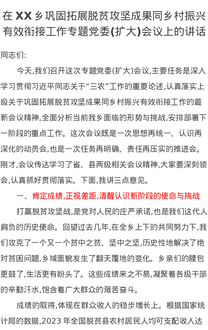 在XX乡巩固拓展脱贫攻坚成果同乡村振兴有效衔接工作专题党委(扩大)会议上的讲话