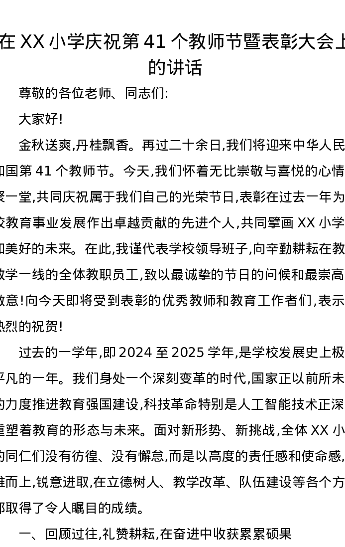 在XX小学庆祝第41个教师节暨表彰大会上的讲话