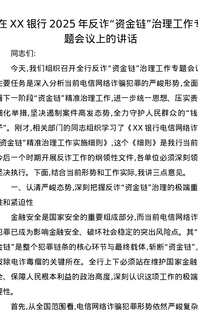 在XX银行2025年反诈“资金链”治理工作专题会议上的讲话