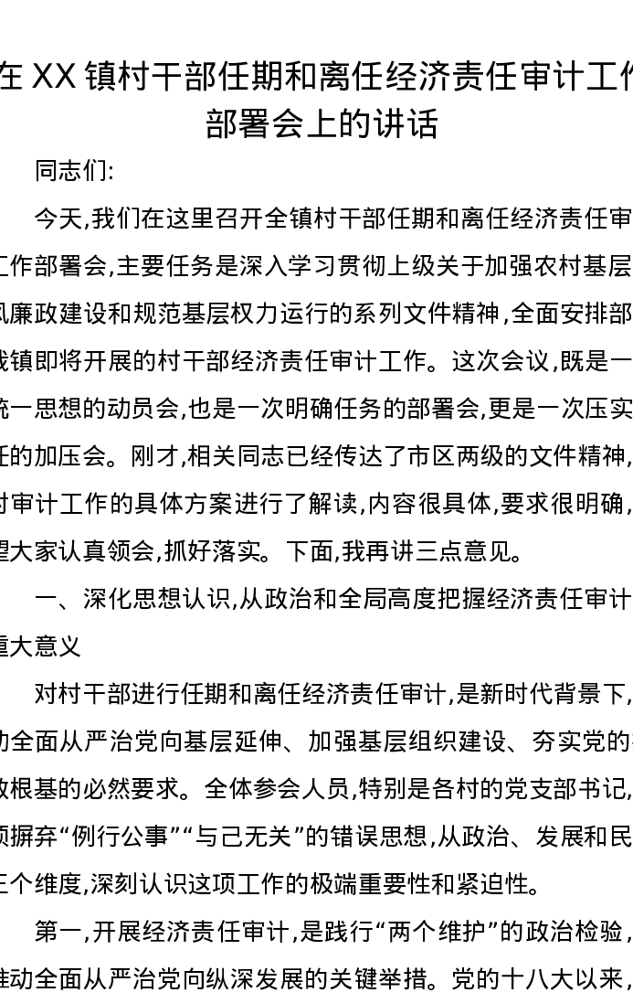在XX镇村干部任期和离任经济责任审计工作部署会上的讲话