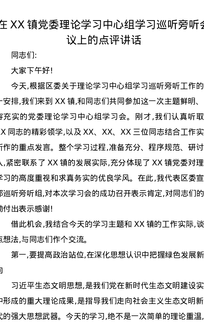 在XX镇党委理论学习中心组学习巡听旁听会议上的点评讲话