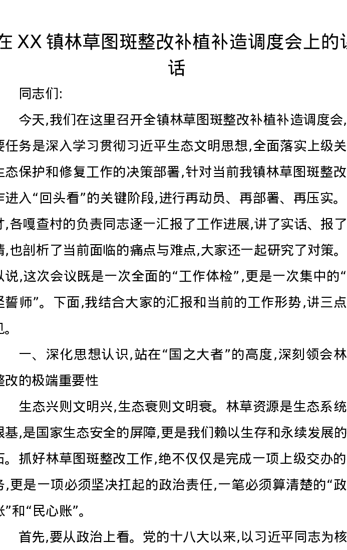 在XX镇林草图斑整改补植补造调度会上的讲话