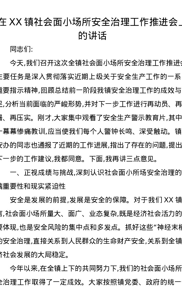 在XX镇社会面小场所安全治理工作推进会上的讲话