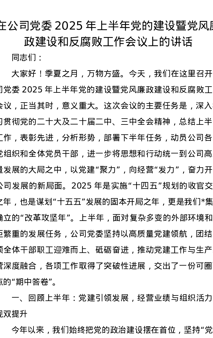 在公司党委2025年上半年党的建设暨党风廉政建设和反腐败工作会议上的讲话