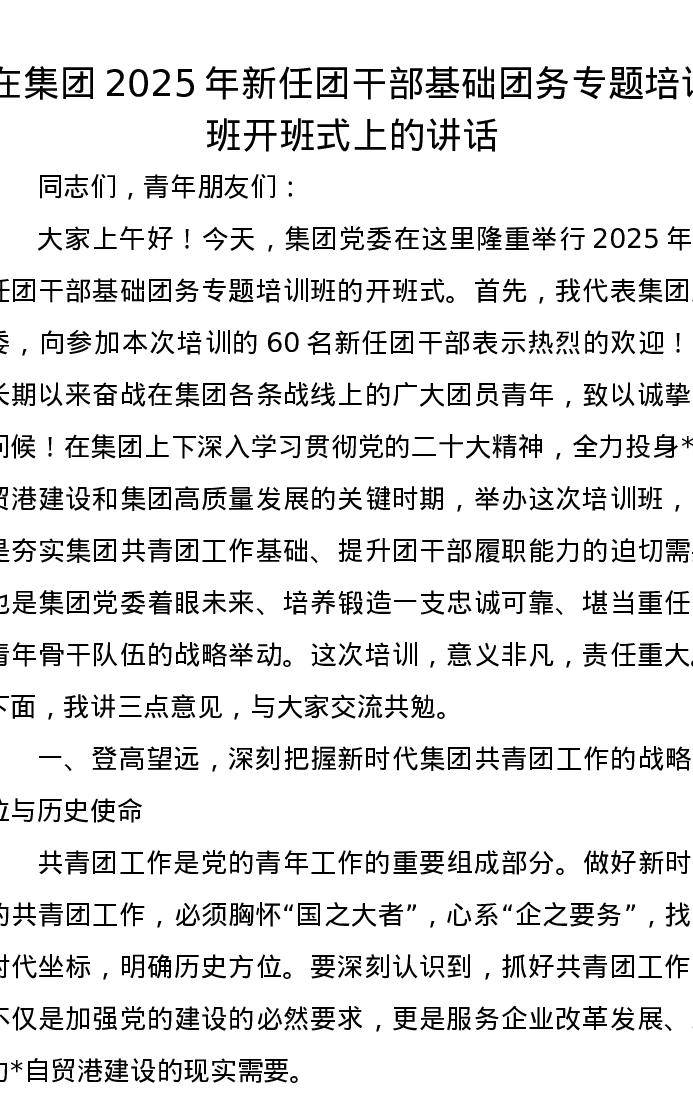 在集团2025年新任团干部基础团务专题培训班开班式上的讲话