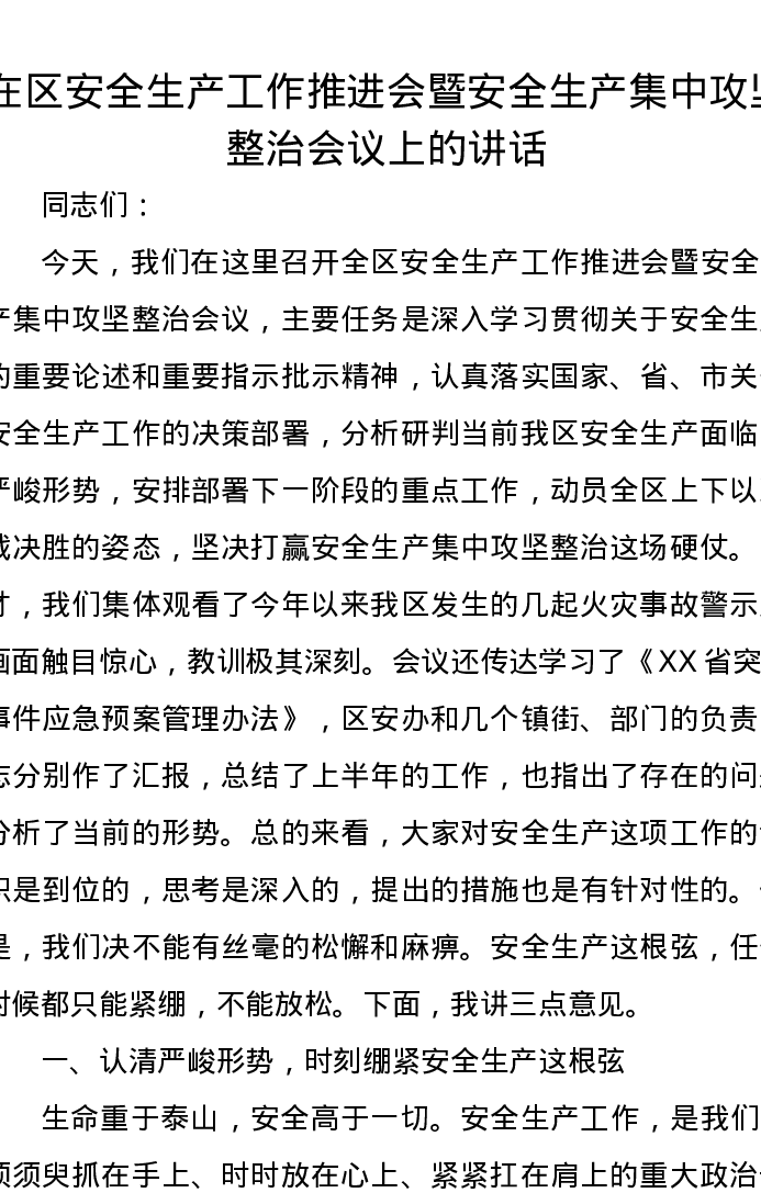 在区安全生产工作推进会暨安全生产集中攻坚整治会议上的讲话