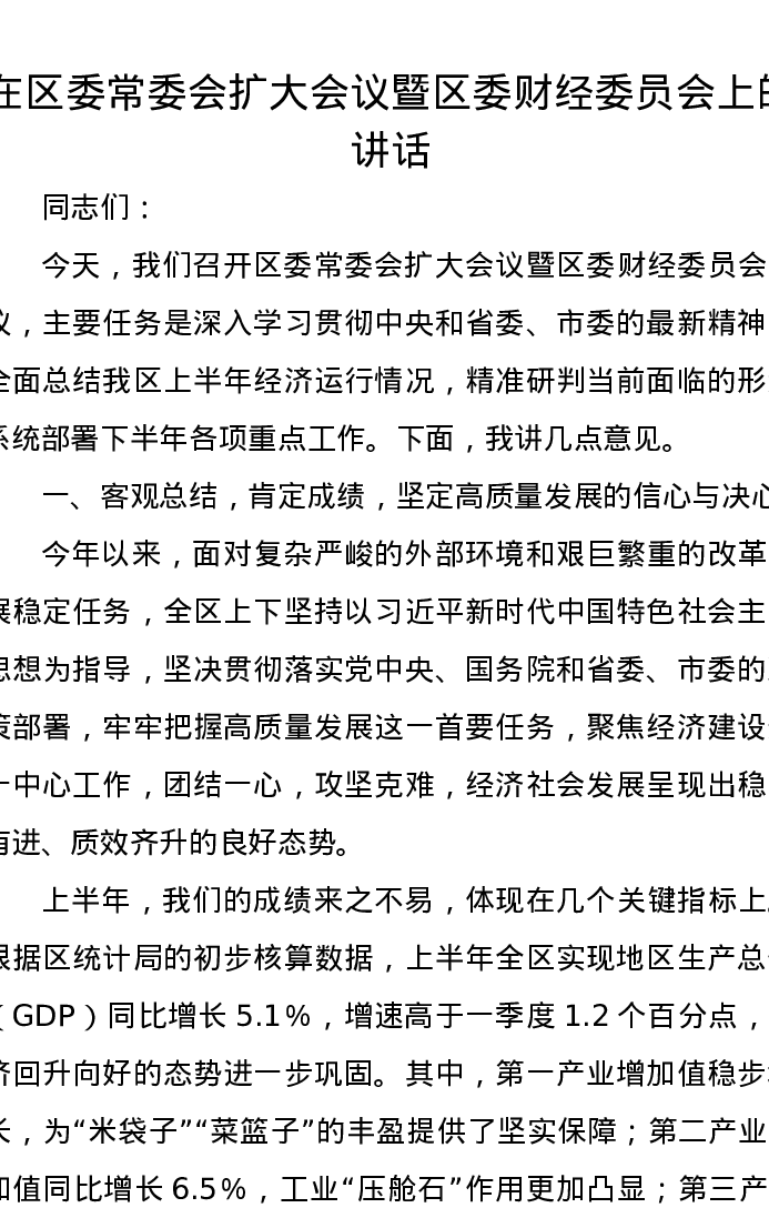 在区委常委会扩大会议暨区委财经委员会上的讲话