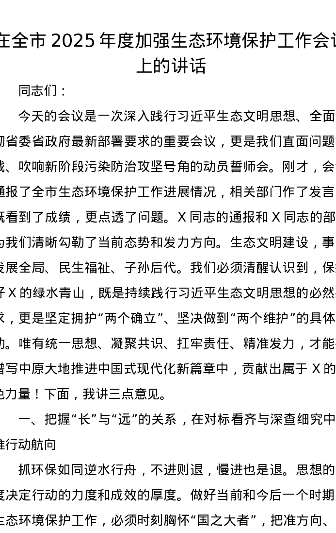在全市2025年度加强生态环境保护工作会议上的讲话