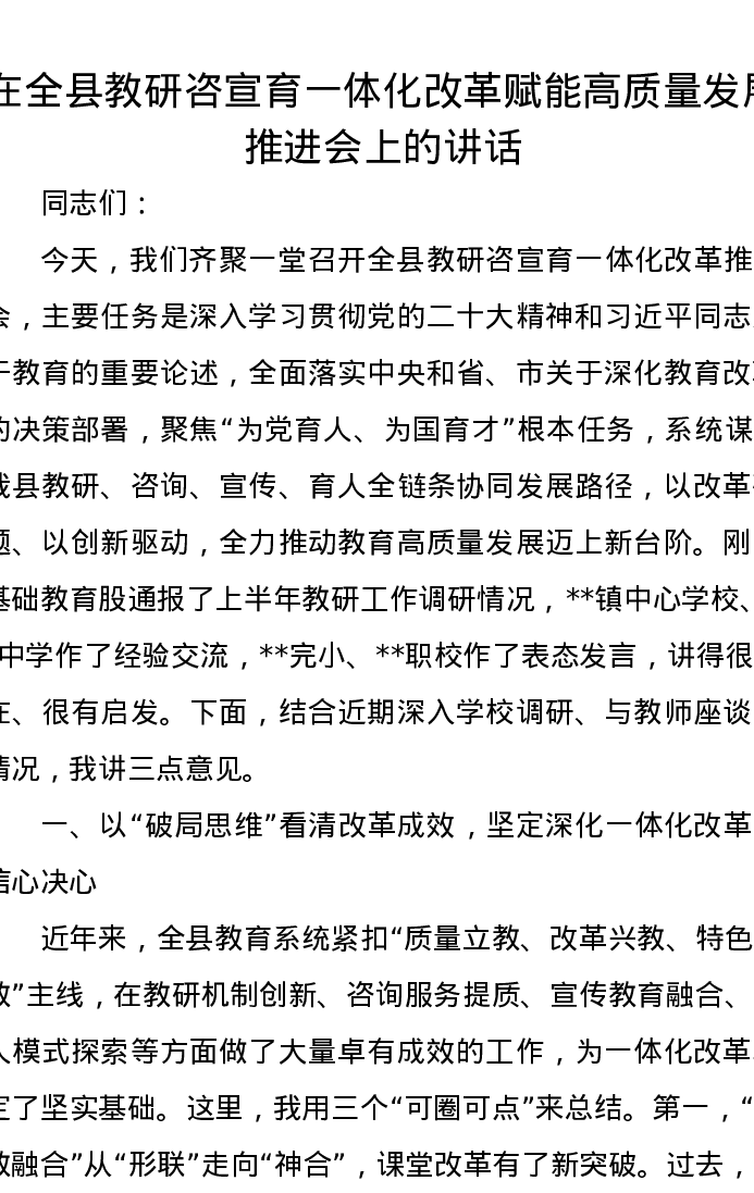 在全县教研咨宣育一体化改革赋能高质量发展推进会上的讲话