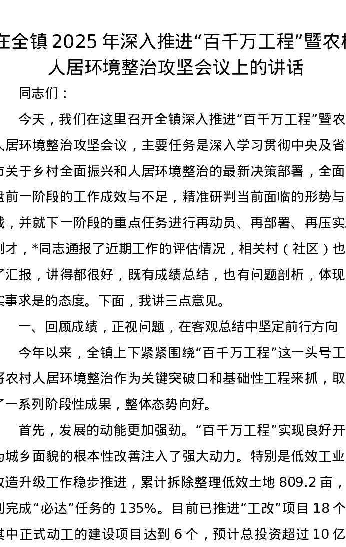 在全镇2025年深入推进“百千万工程”暨农村人居环境整治攻坚会议上的讲话