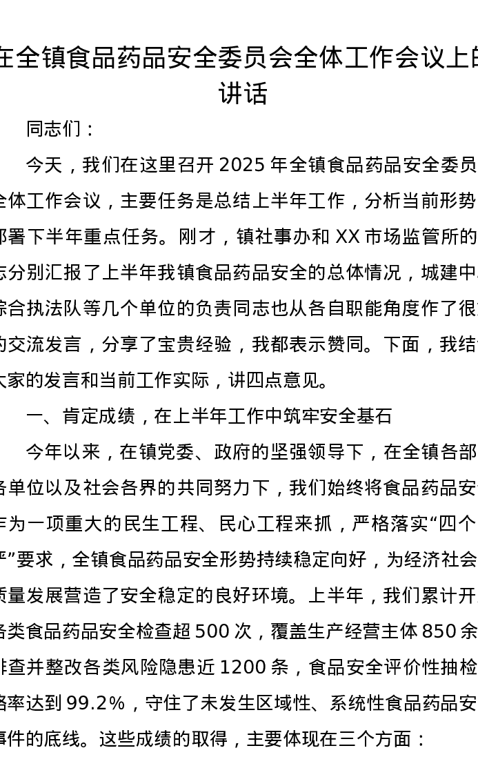 在全镇食品药品安全委员会全体工作会议上的讲话