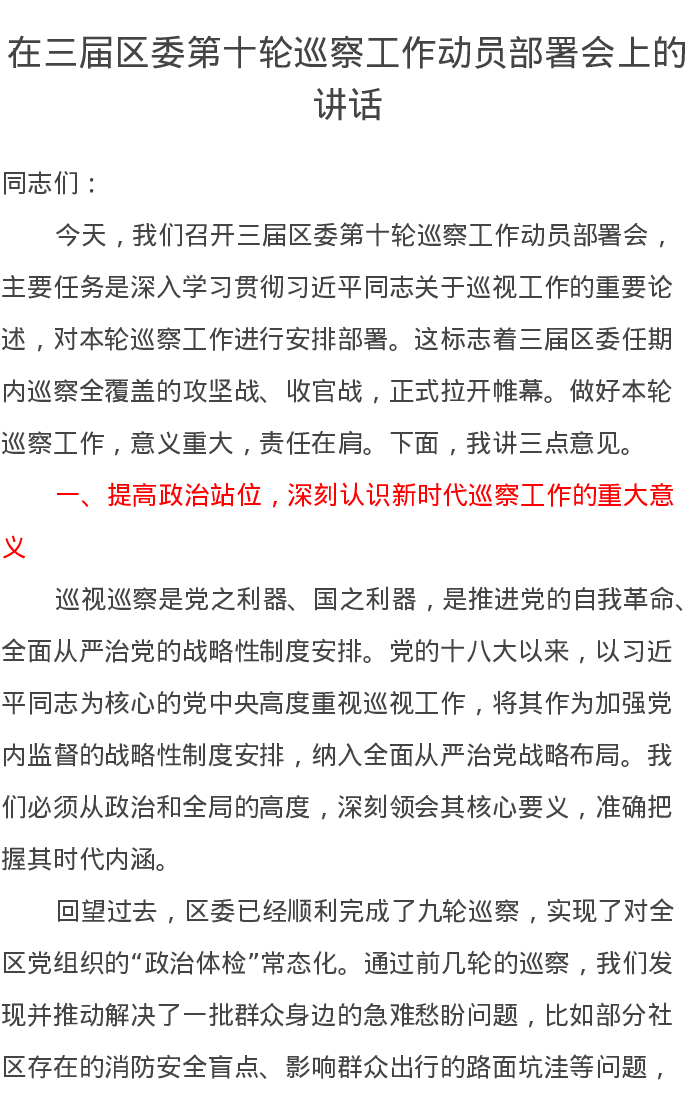 在三届区委第十轮巡察工作动员部署会上的讲话
