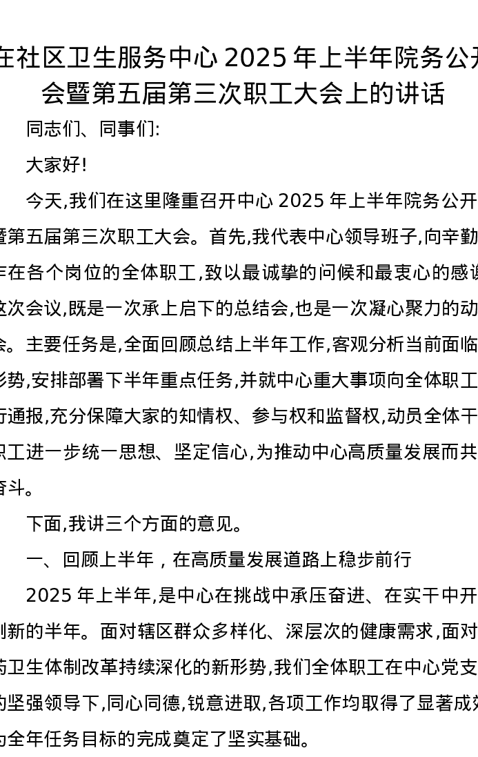 在社区卫生服务中心2025年上半年院务公开会暨第五届第三次职工大会上的讲话