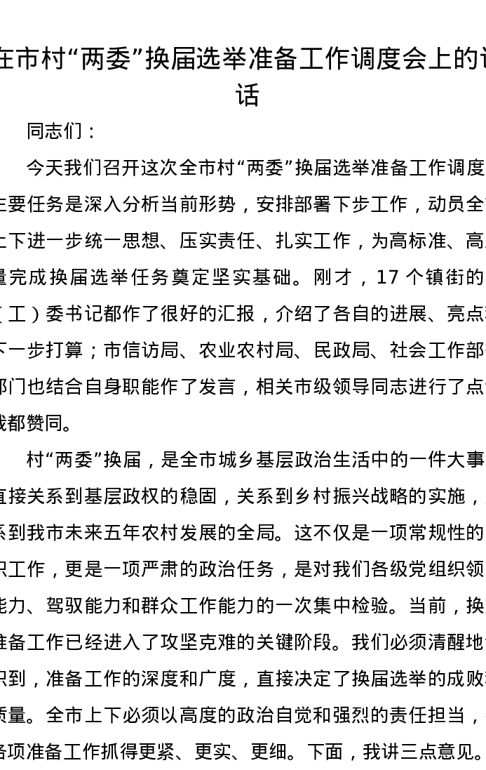 在市村“两委”换届选举准备工作调度会上的讲话