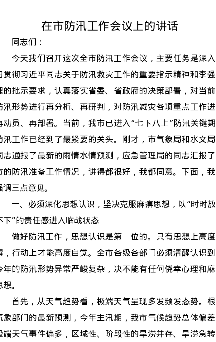 在市防汛工作会议上的讲话
