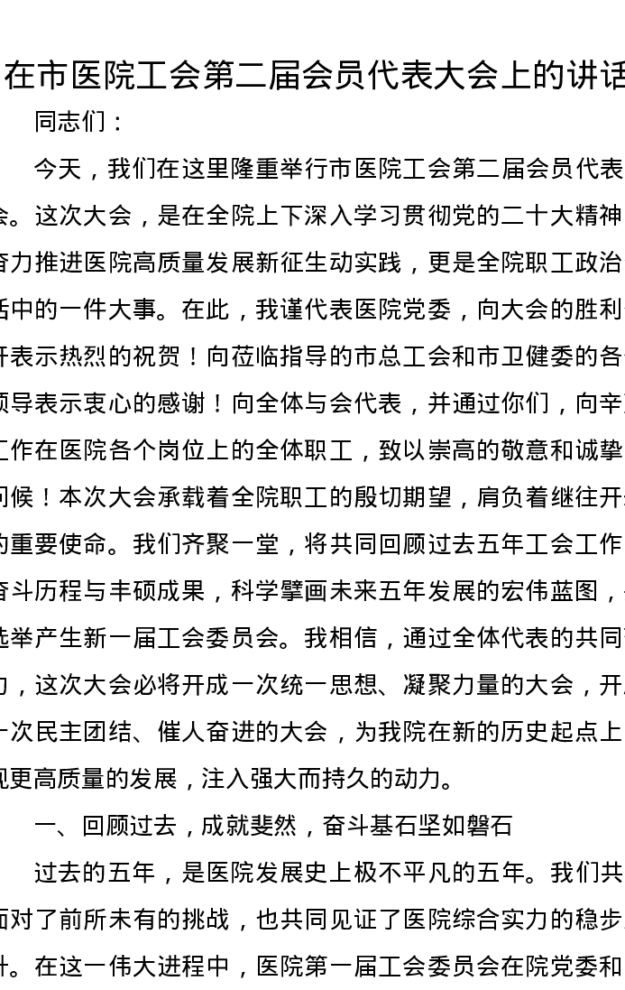 在市医院工会第二届会员代表大会上的讲话