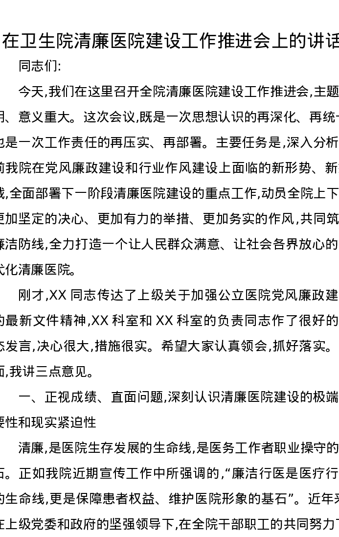 在卫生院清廉医院建设工作推进会上的讲话