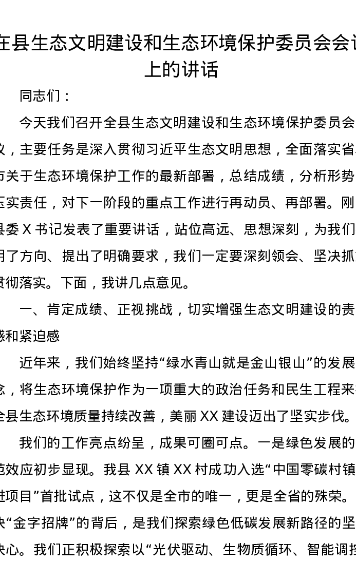 在县生态文明建设和生态环境保护委员会会议上的讲话