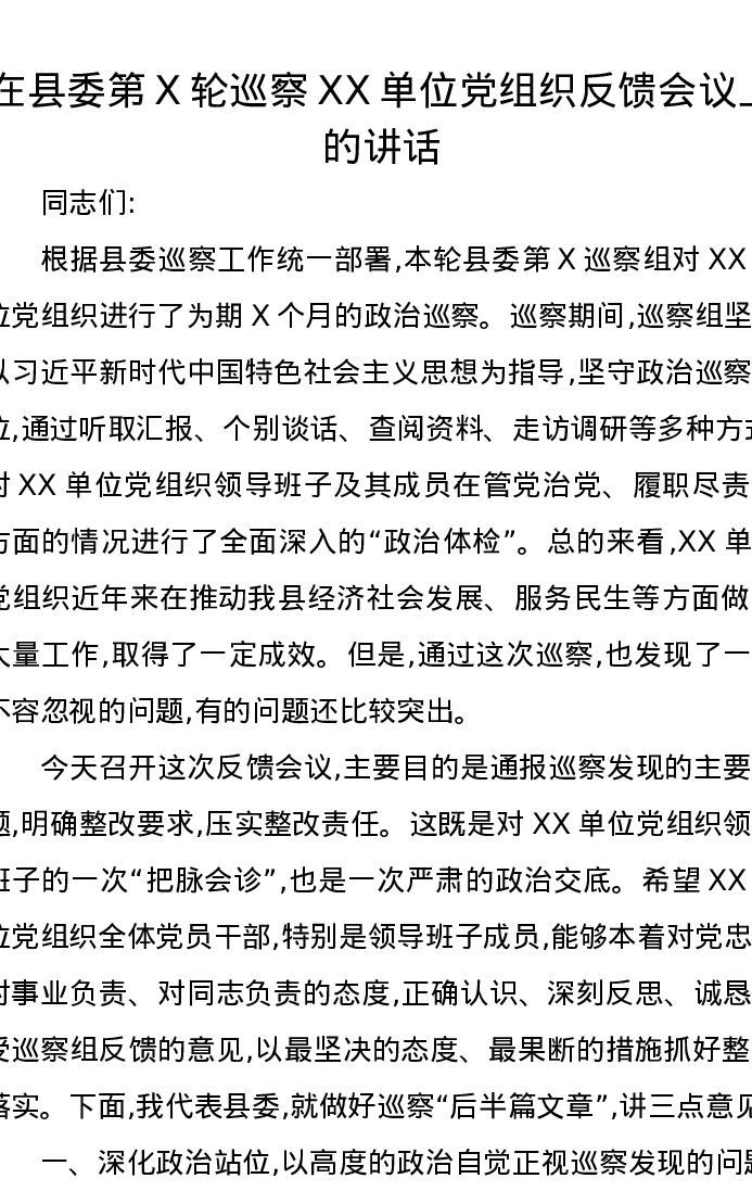 在县委第X轮巡察XX单位党组织反馈会议上的讲话