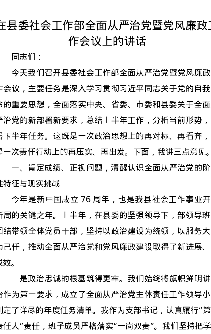 在县委社会工作部全面从严治党暨党风廉政工作会议上的讲话