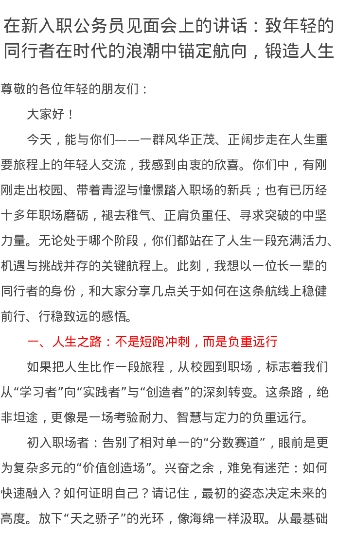 在新入职公务员见面会上的讲话:致年轻的同行者在时代的浪潮中锚定航向,锻造人生