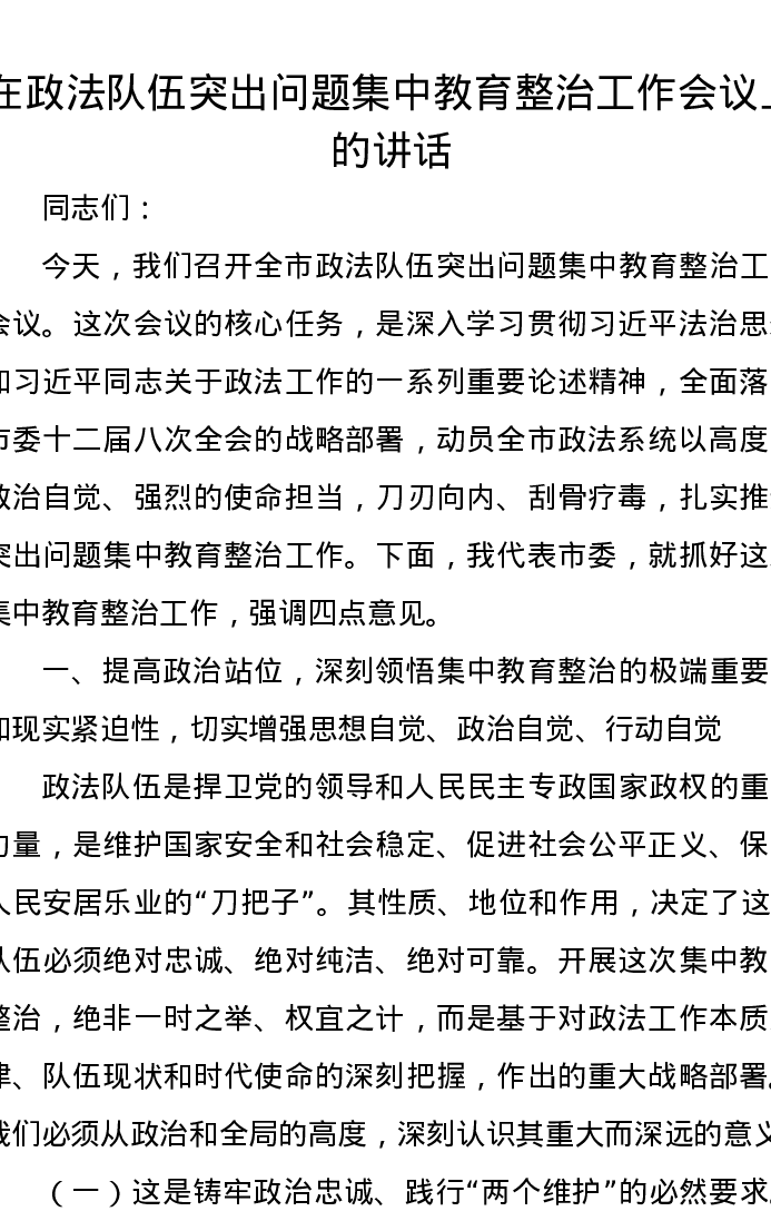在政法队伍突出问题集中教育整治工作会议上的讲话