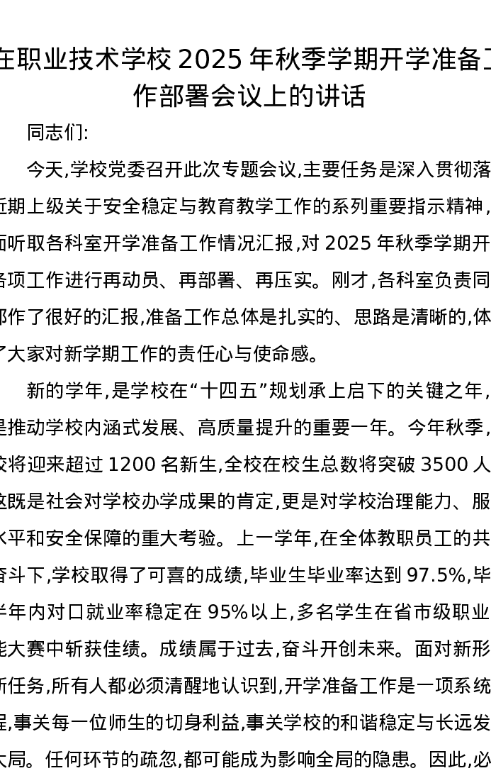 在职业技术学校2025年秋季学期开学准备工作部署会议上的讲话