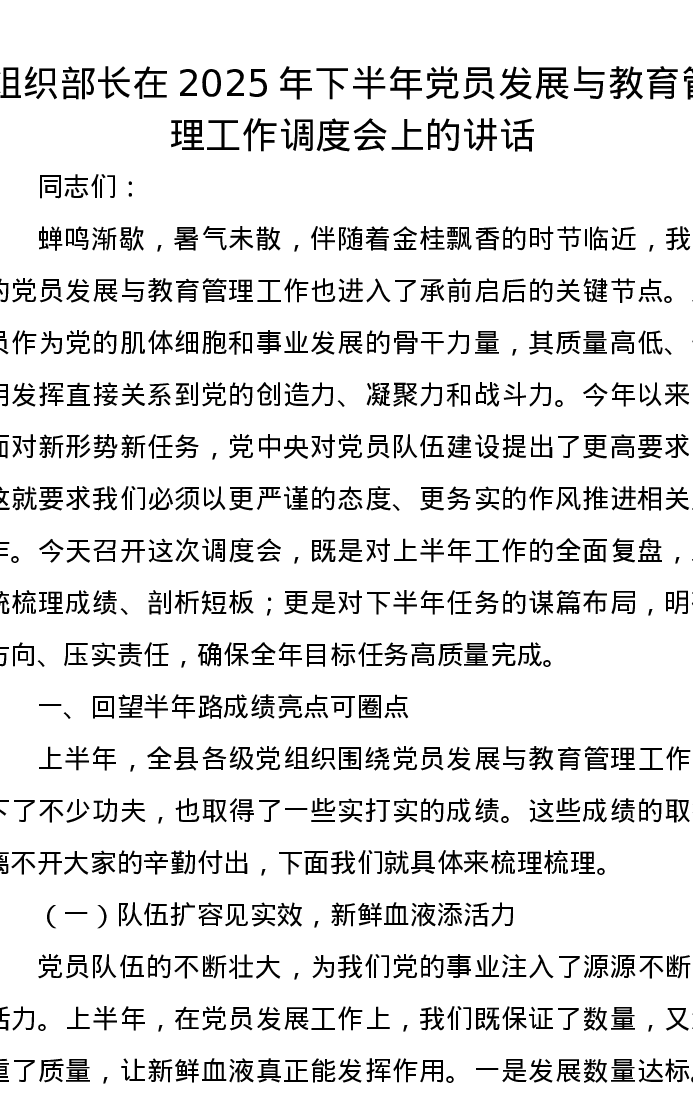 组织部长在2025年下半年党员发展与教育管理工作调度会上的讲话