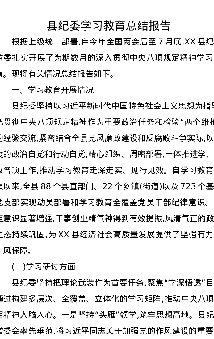 XX县纪委关于学习教育的总结报告