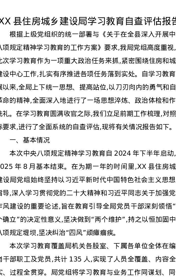 XX县住房城乡建设学习教育自查评估报告