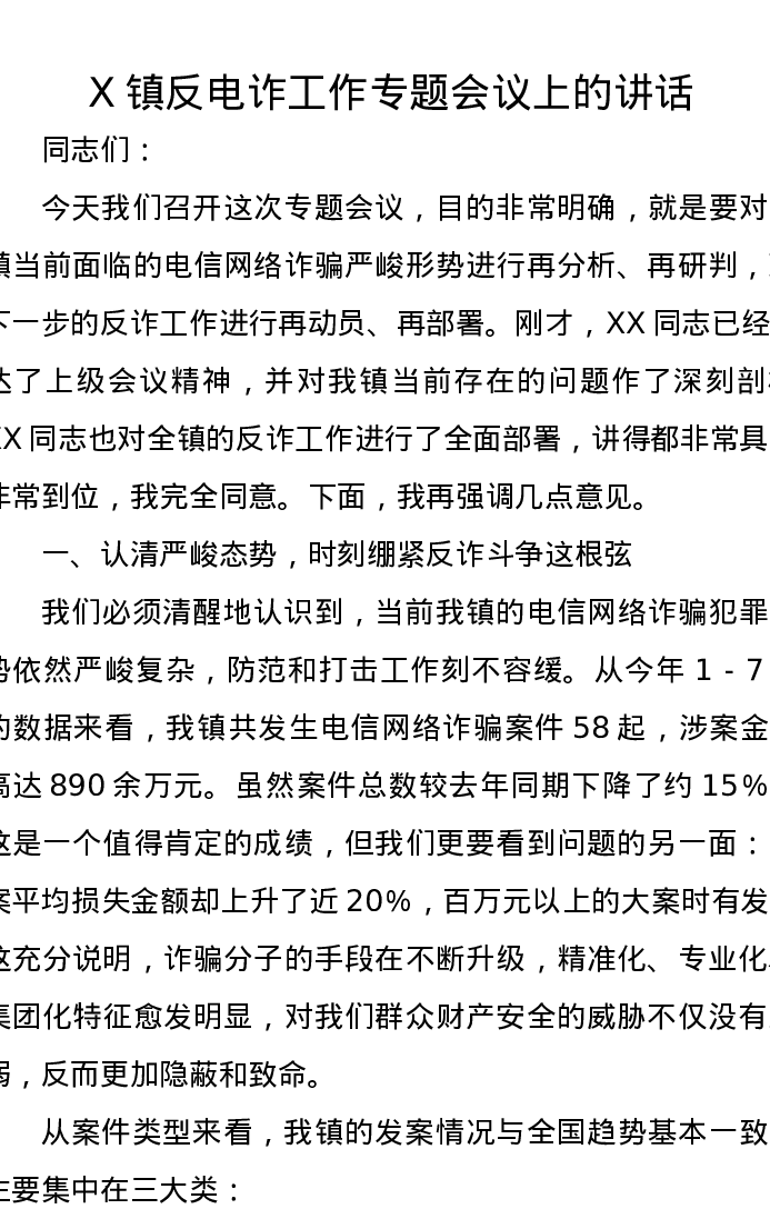 X镇反电诈工作专题会议上的讲话