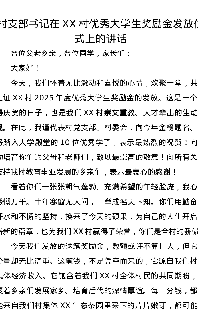 村支部书记在XX村优秀大学生奖励金发放仪式上的讲话