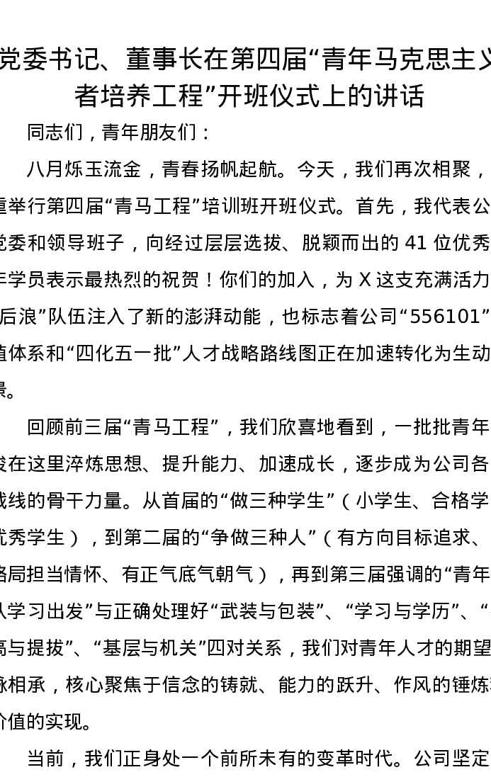 党委书记、董事长在第四届“青年马克思主义者培养工程”开班仪式上的讲话