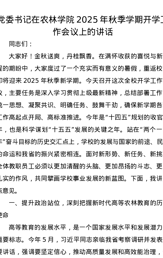 党委书记在农林学院2025年秋季学期开学工作会议上的讲话