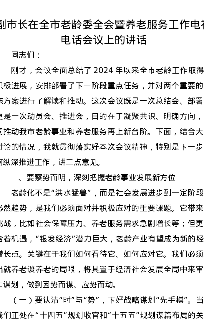 副市长在全市老龄委全会暨养老服务工作电视电话会议上的讲话