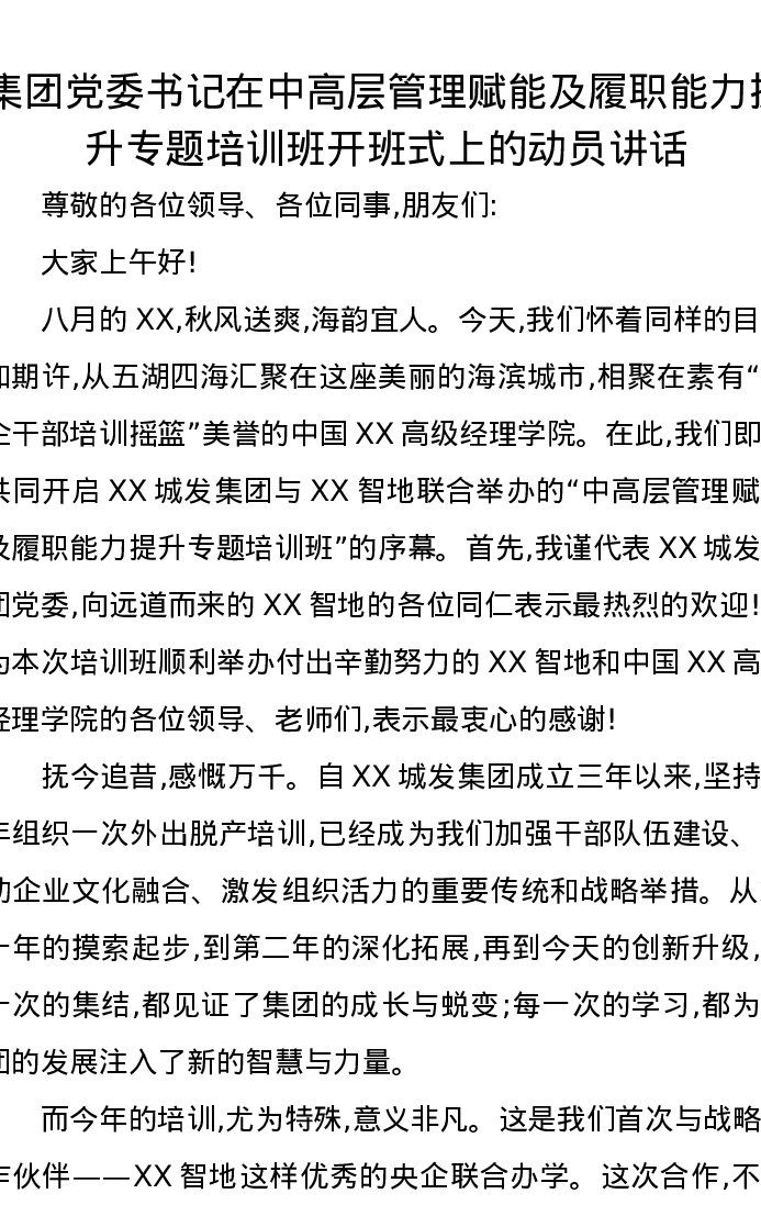 集团党委书记在中高层管理赋能及履职能力提升专题培训班开班式上的动员讲话