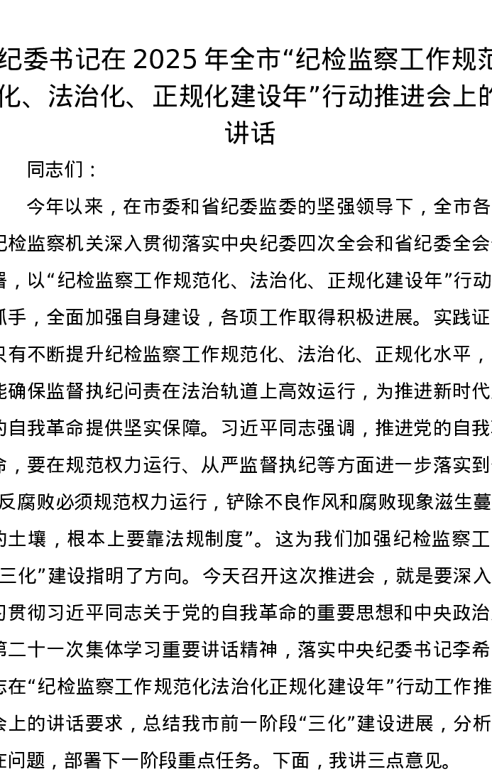 纪委书记在2025年全市“纪检监察工作规范化、法治化、正规化建设年”行动推进会上的讲话