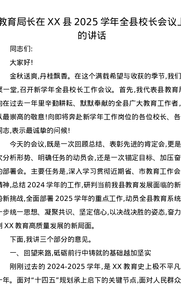 教育局长在XX县2025学年全县校长会议上的讲话
