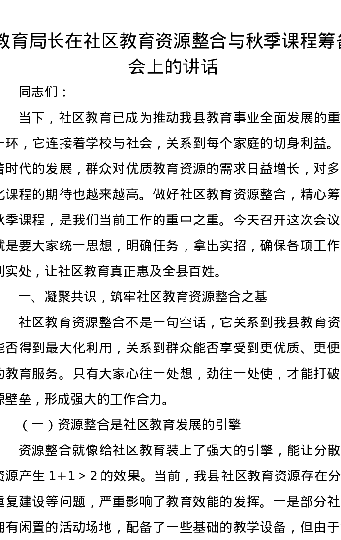 教育局长在社区教育资源整合与秋季课程筹备会上的讲话
