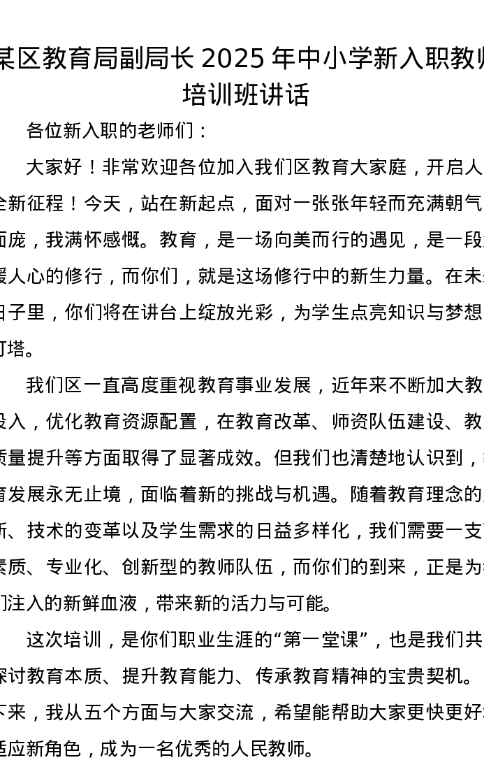 某区教育局副局长2025年中小学新入职教师培训班讲话
