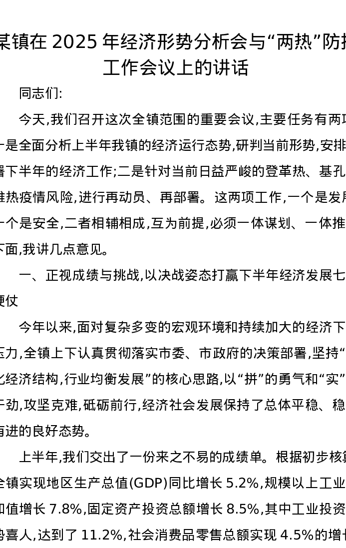 某镇在2025年经济形势分析会与“两热”防控工作会议上的讲话