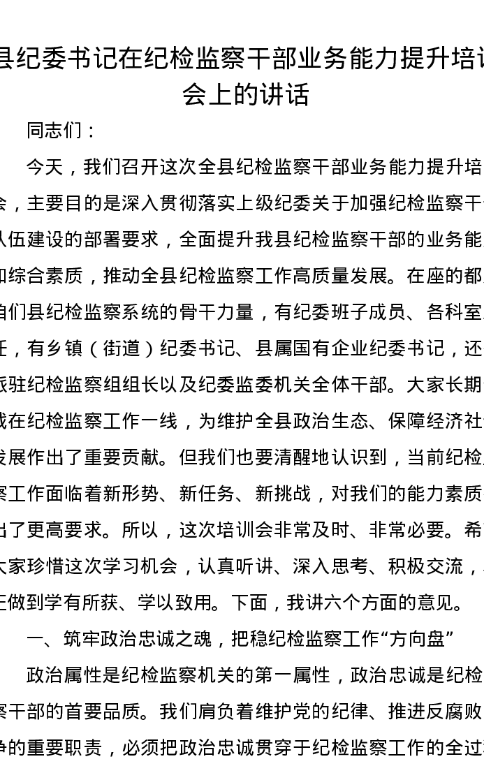 县纪委书记在纪检监察干部业务能力提升培训会上的讲话