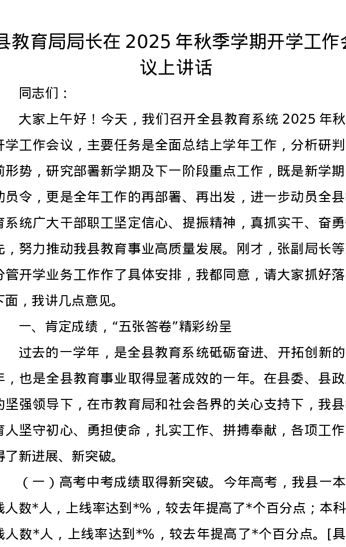 县教育局局长在2025年秋季学期开学工作会议上讲话